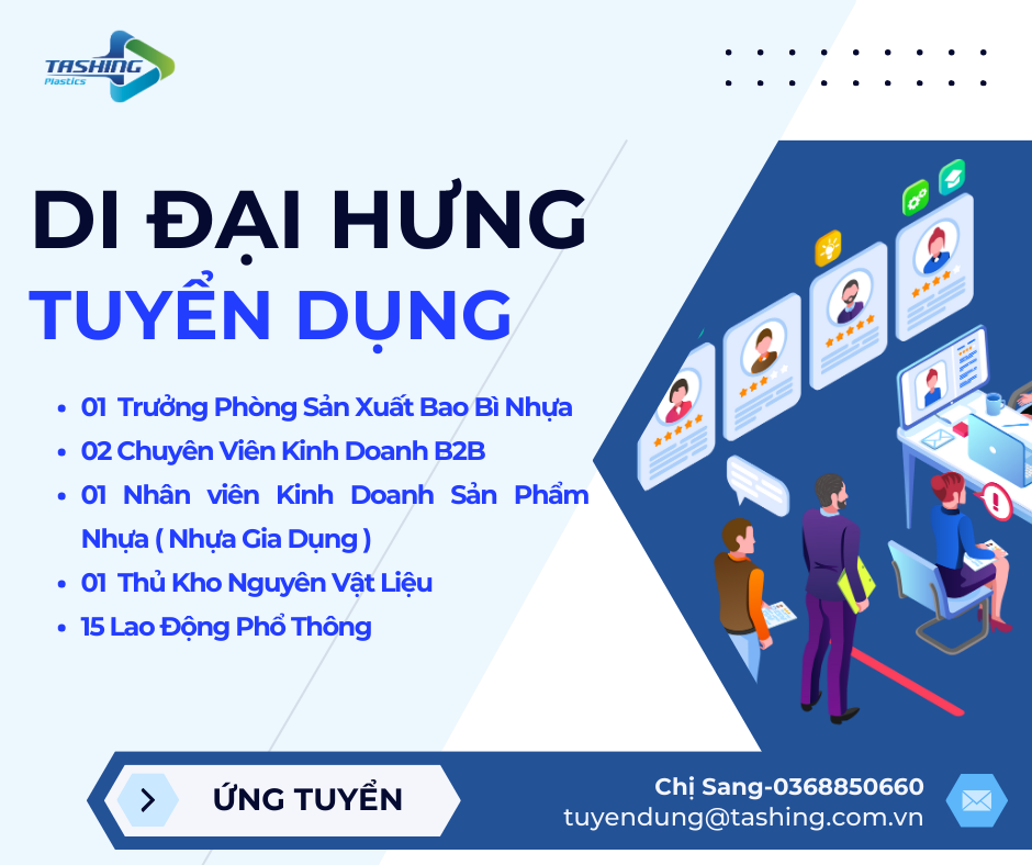 Chúng tôi đang tìm kiếm nhân sự để cùng đồng hành và phát triển. Nếu bạn đam mê lĩnh vực sản xuất nhựa và bao bì, có năng lực chuyên môn và mong muốn góp phần xây dựng một môi trường làm việc tích cực, sáng tạo, hãy gia nhập đội ngũ của chúng tôi. Đây là cơ hội tuyệt vời để bạn phát triển sự nghiệp trong một công ty hàng đầu trong ngành, với nhiều cơ hội thăng tiến và phúc lợi hấp dẫn.